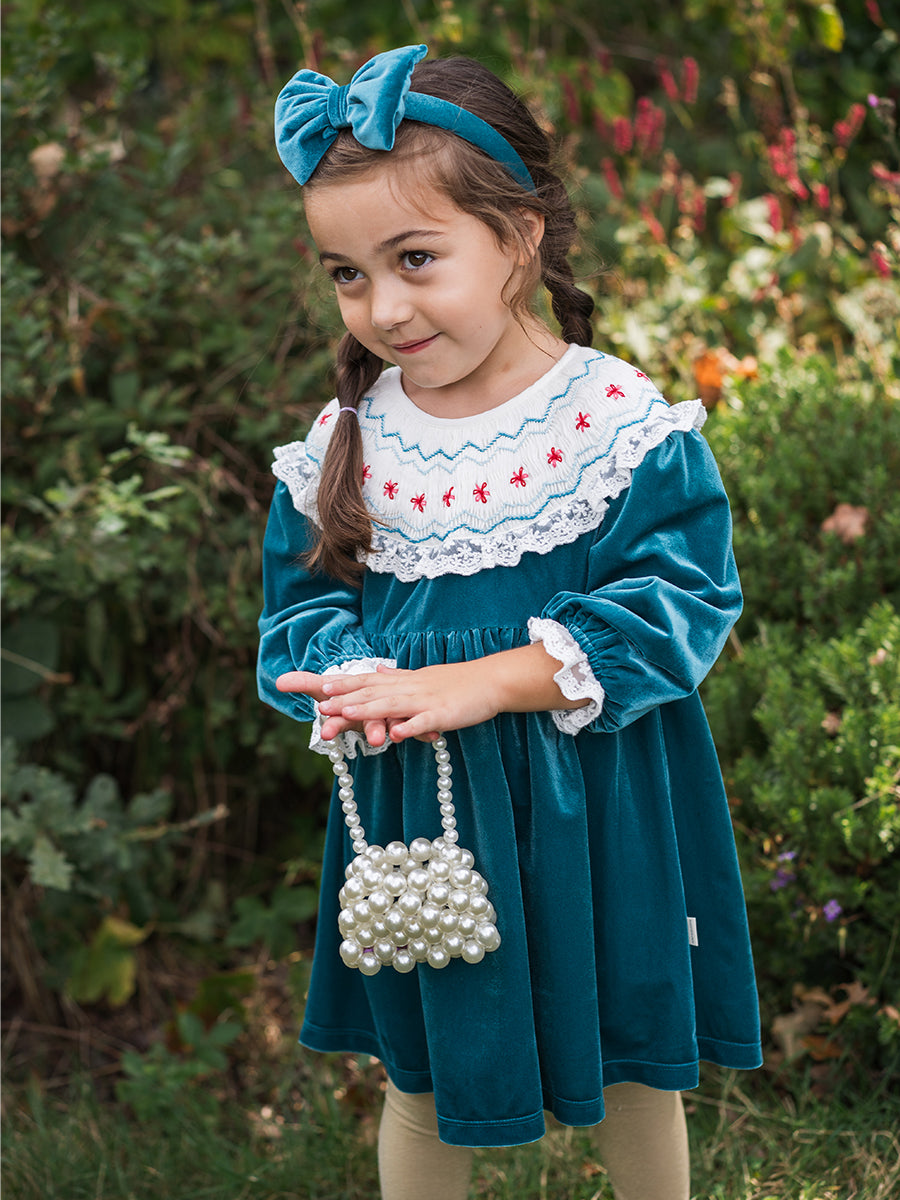 Bella Hand-Smocked Velvet Dress, Lake Green