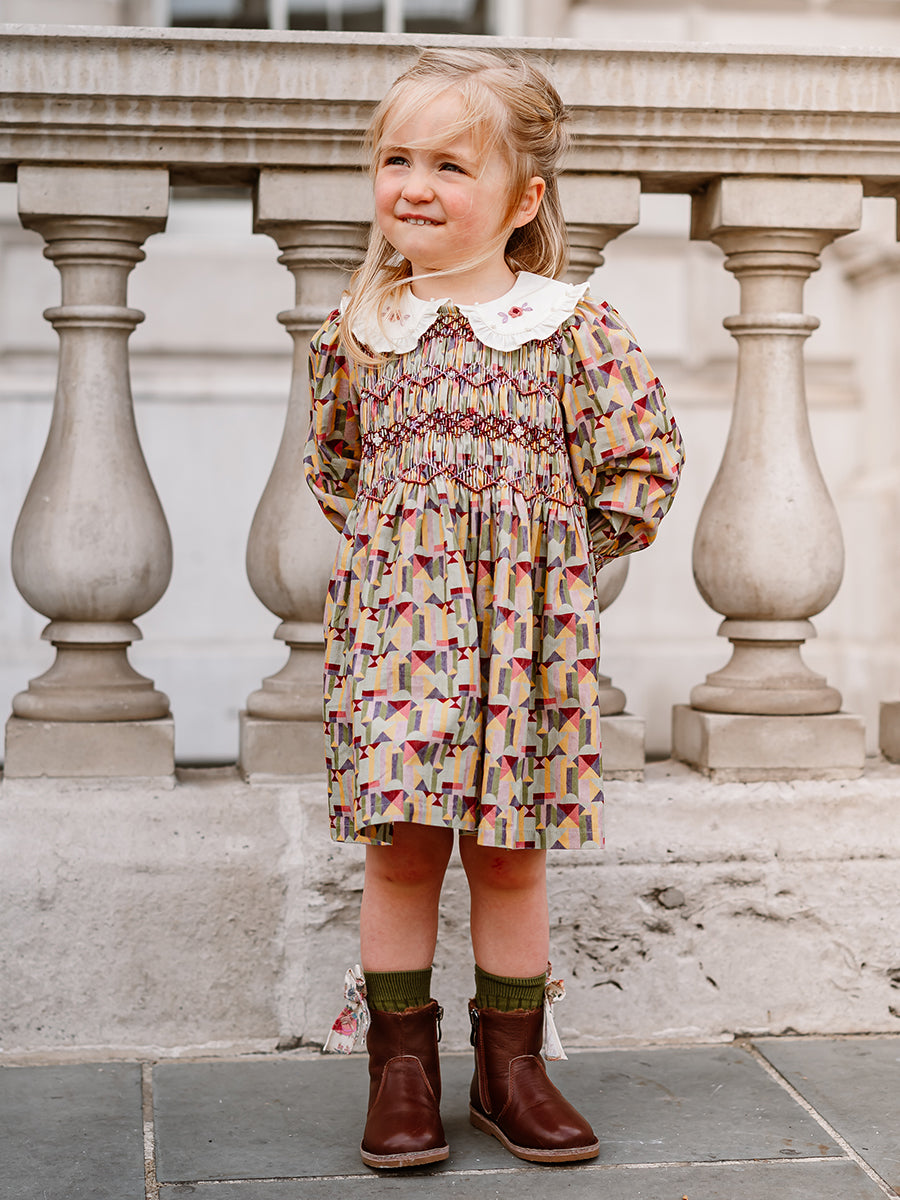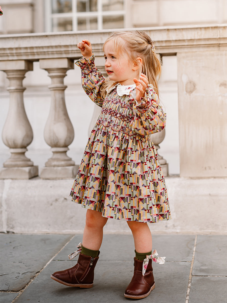 Izzy Hand-Smocking Dress, Colourful Geo, Purple
