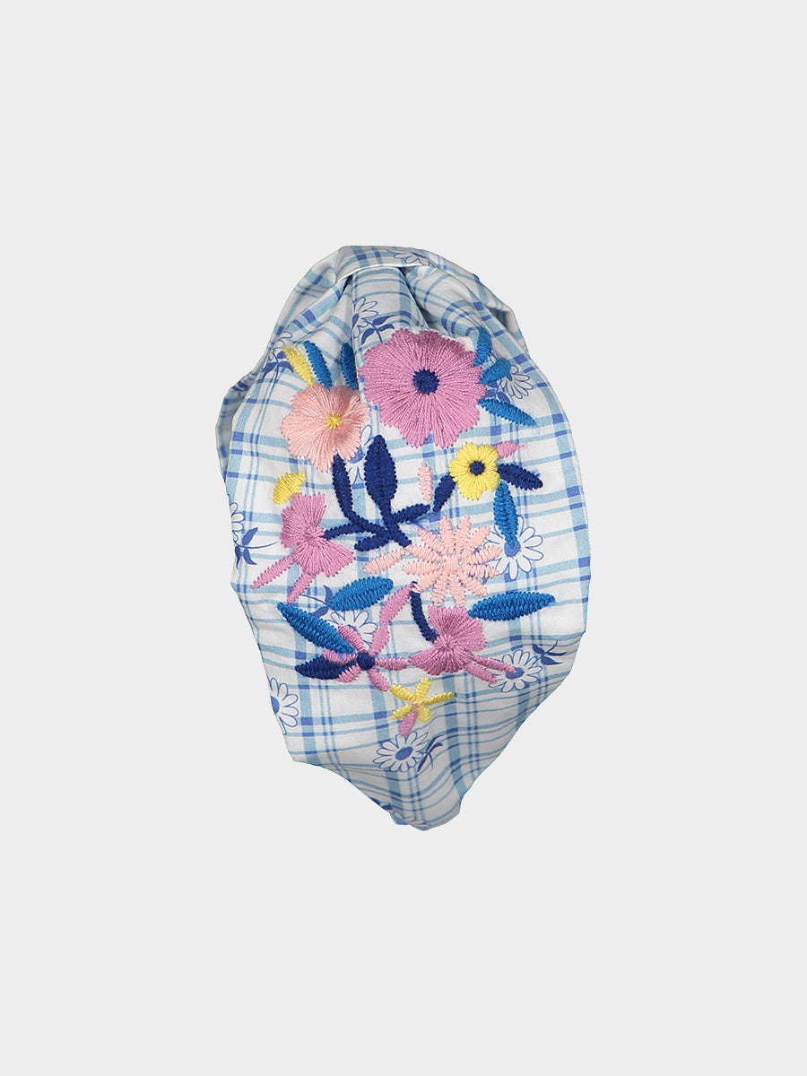 Stirnband mit handgefertigter Stickerei, blau kariert