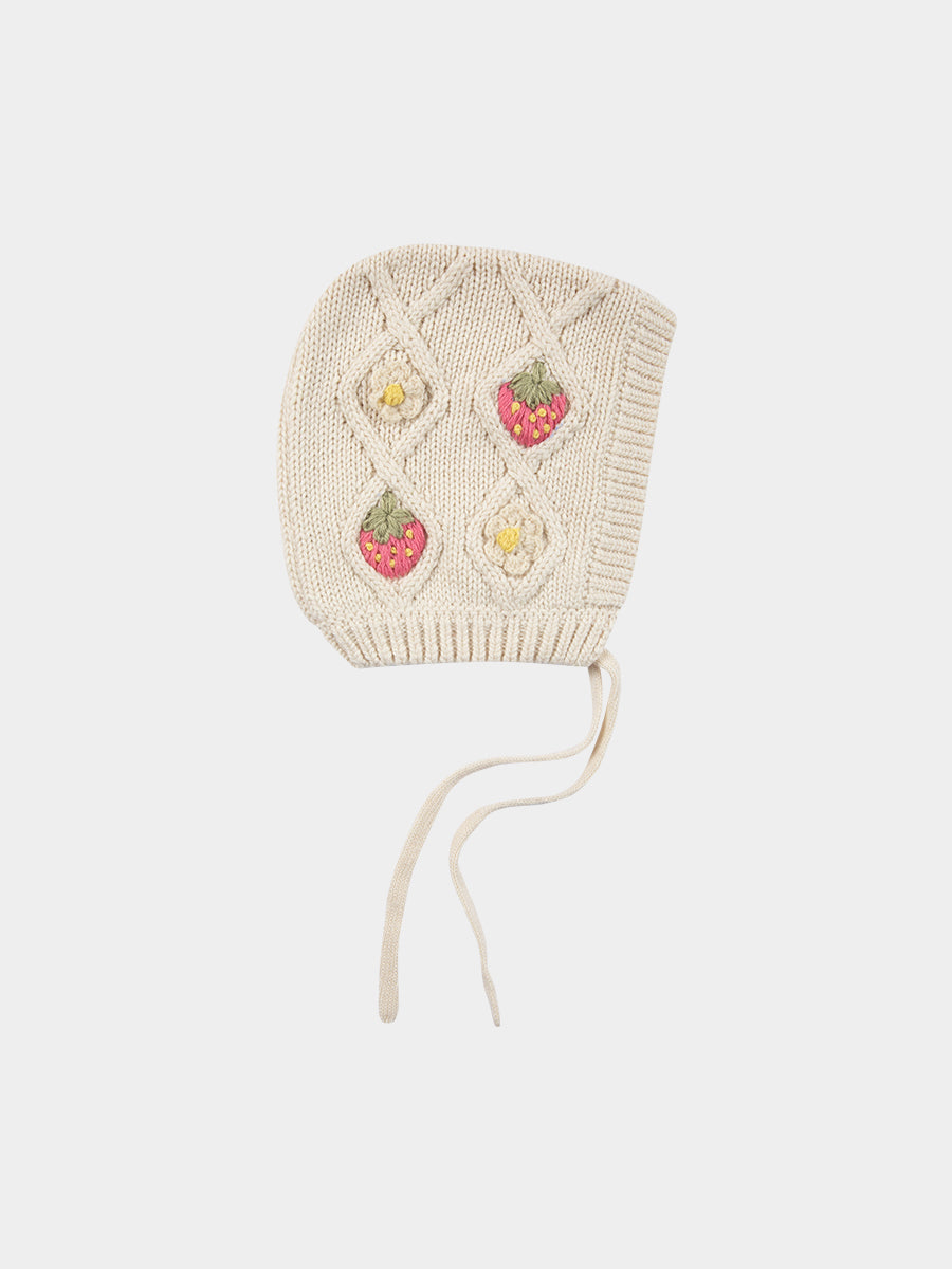 Strawberry Hand-Embroidered Bonnet, Crème Brulee