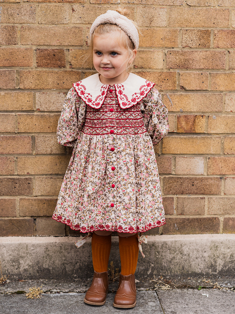Jennie Hand-Smocked Dress, Wildflower Polka, Burgundy