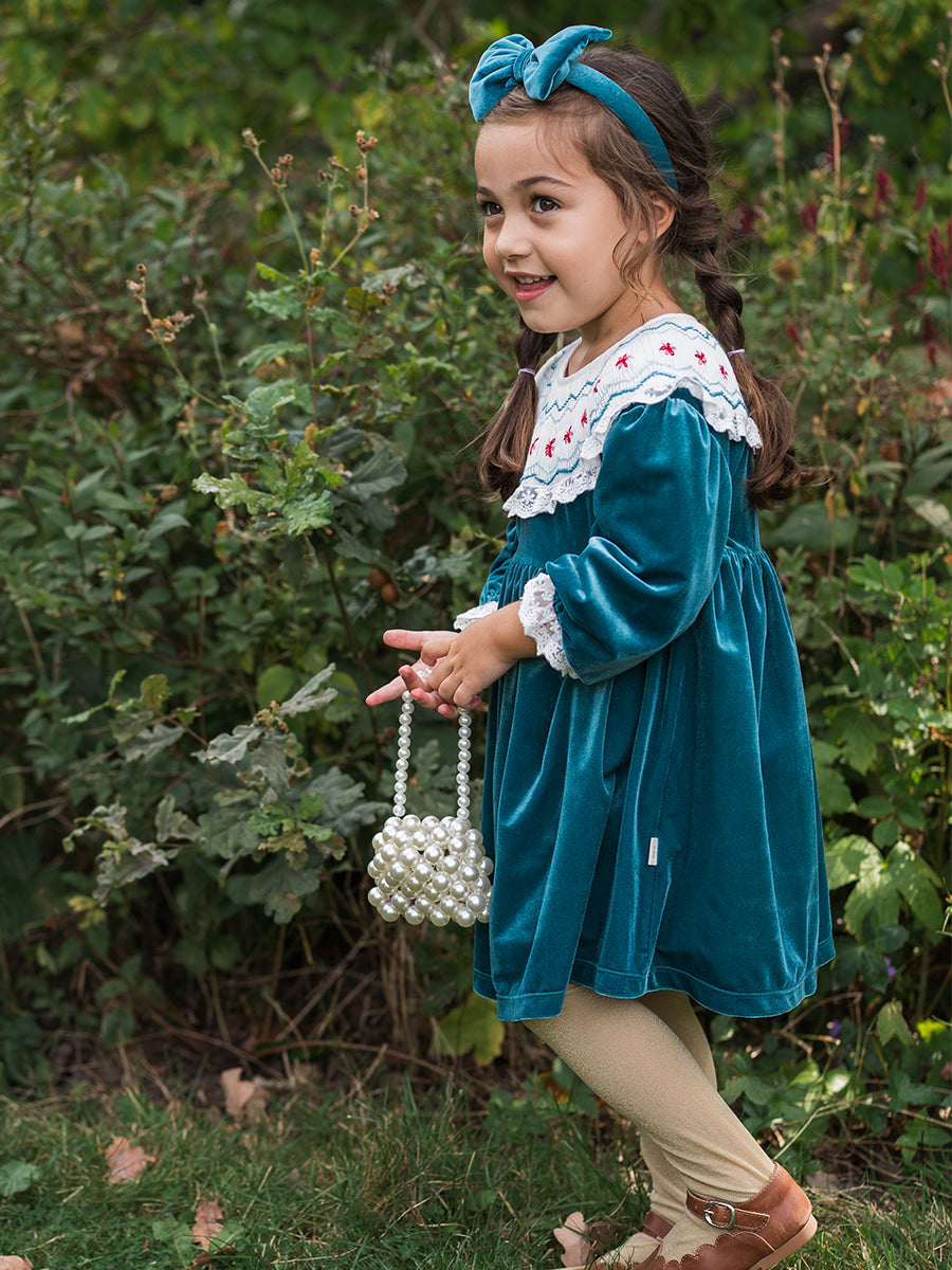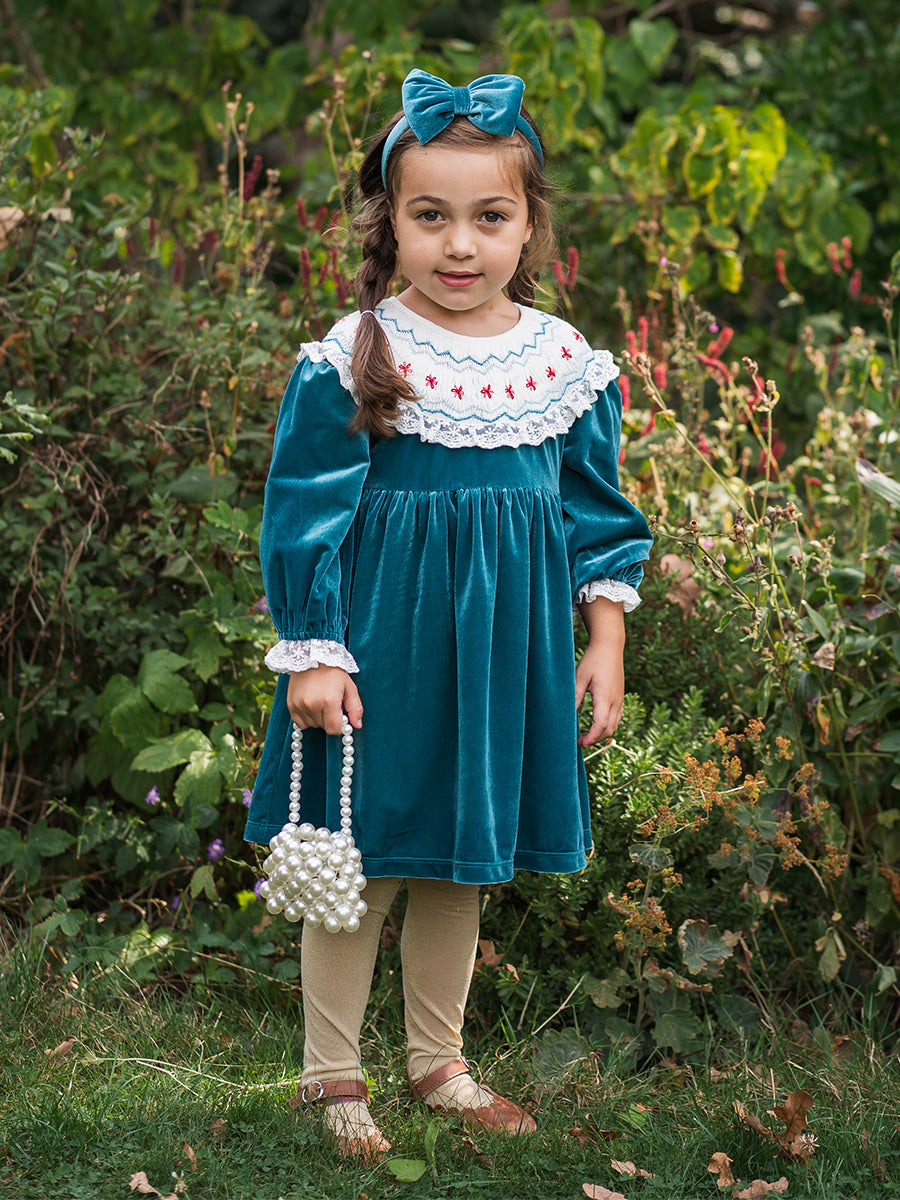 Bella Hand-Smocked Velvet Dress, Lake Green