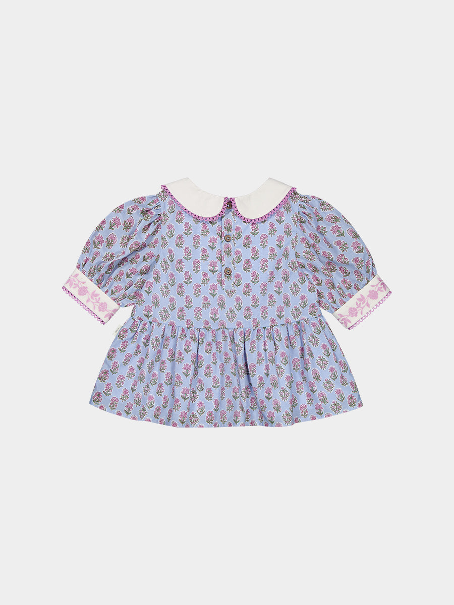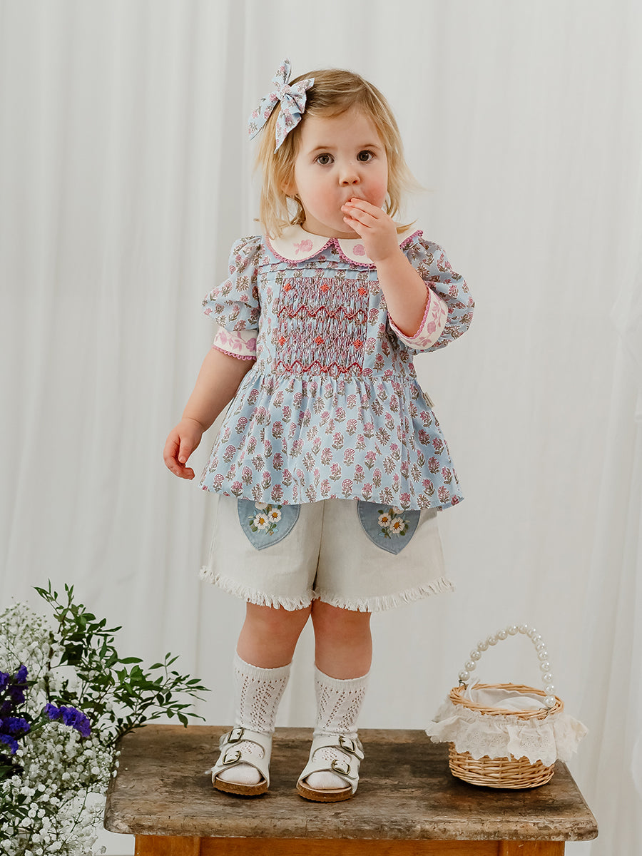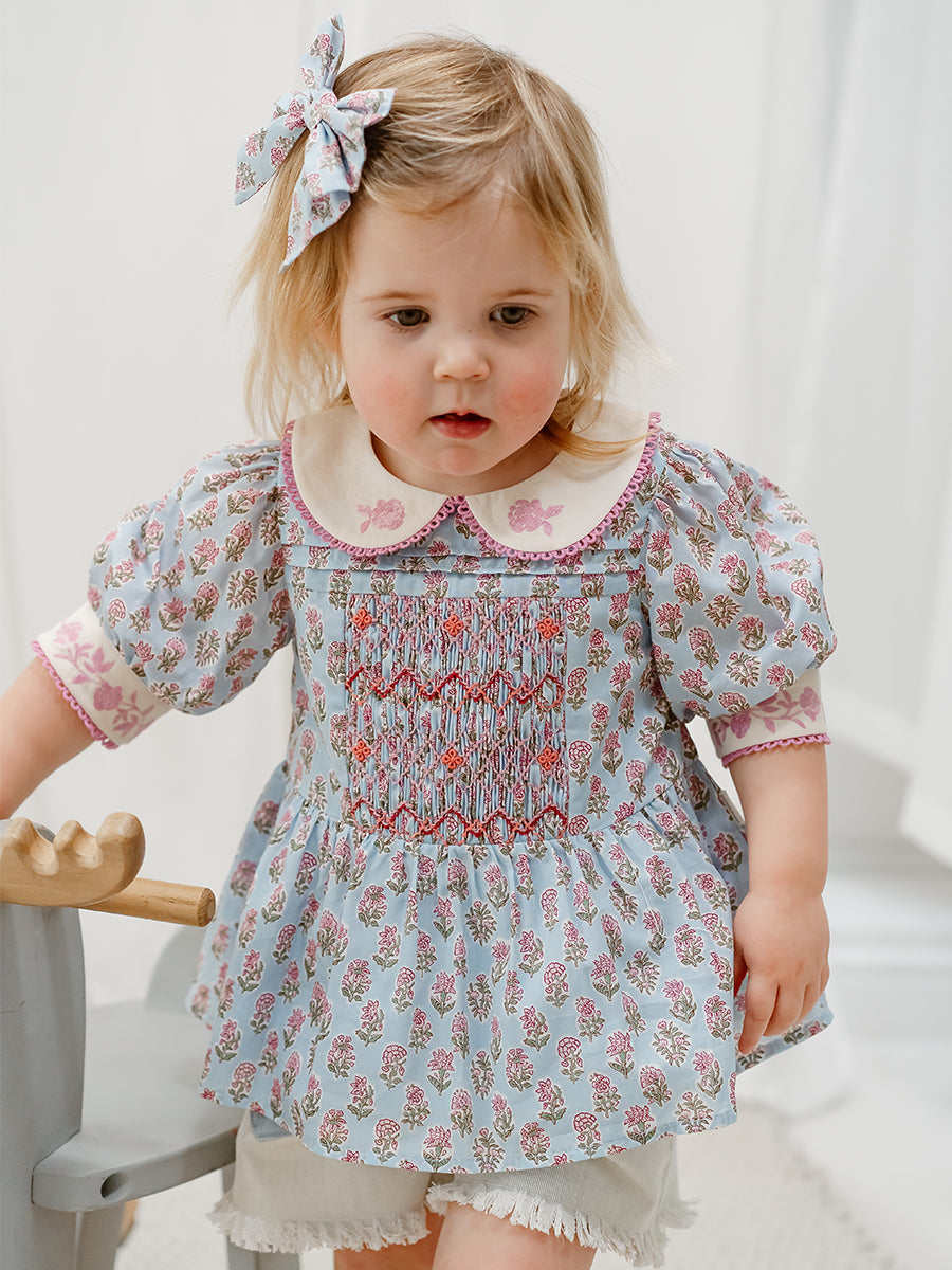 Trapani Hand-Embroidered Blouse, Spring Delight, Blue